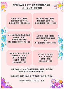 ・回復へ向かうために必要な知識・技術を学ぶ ・依存症で困っているご本人とご家族ともに幸せになる |